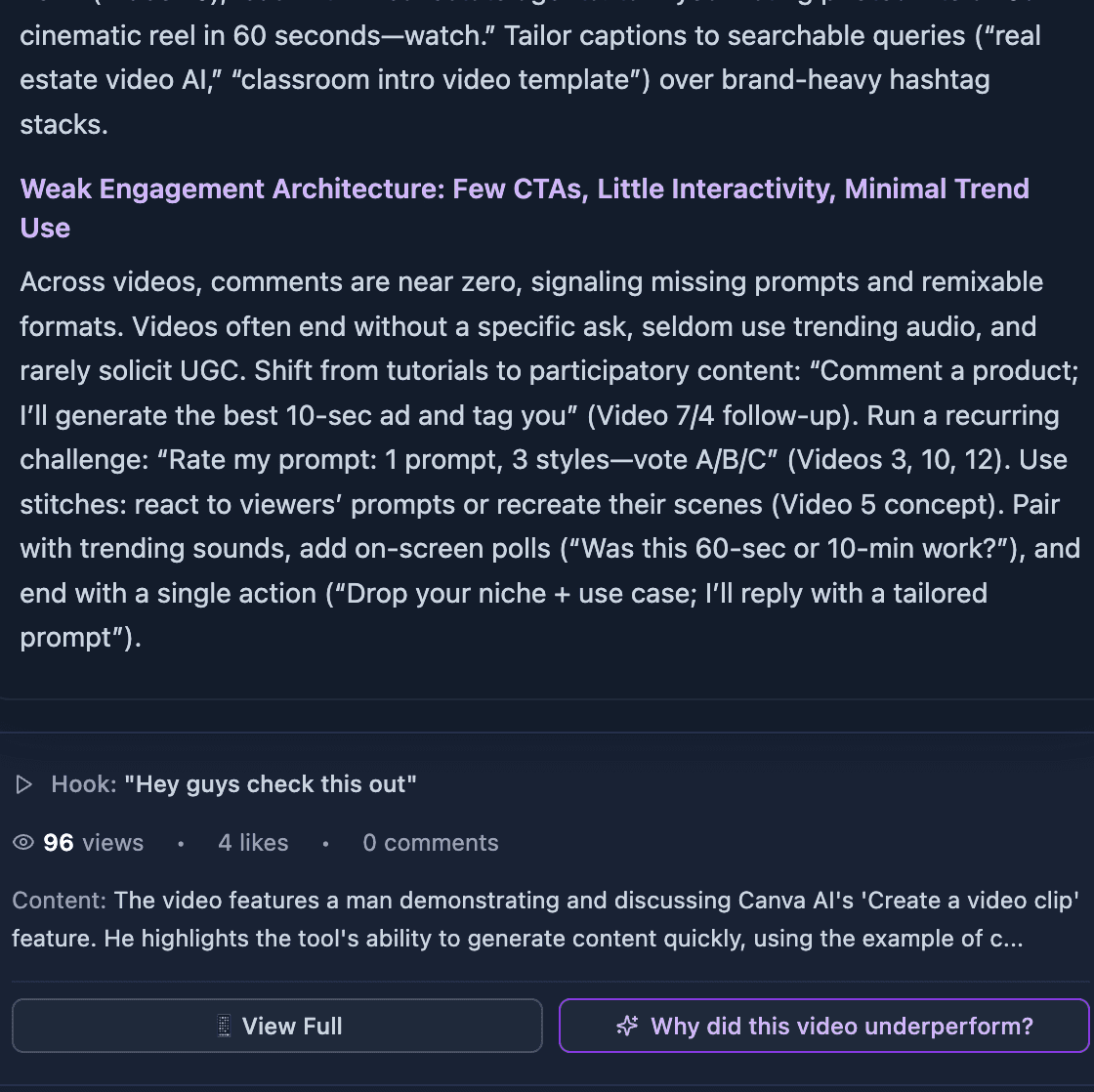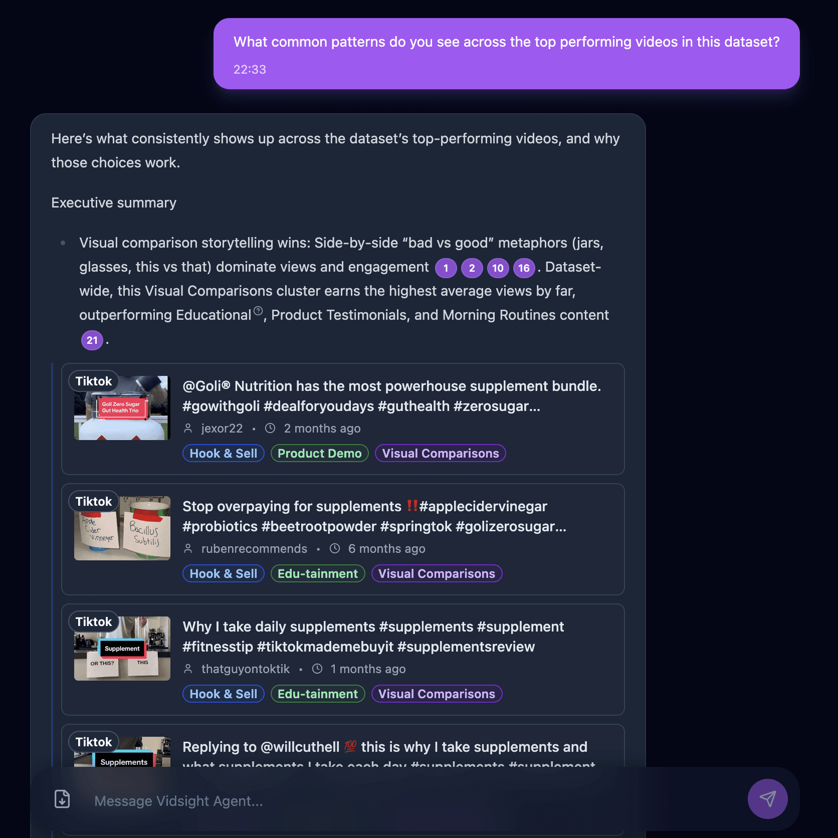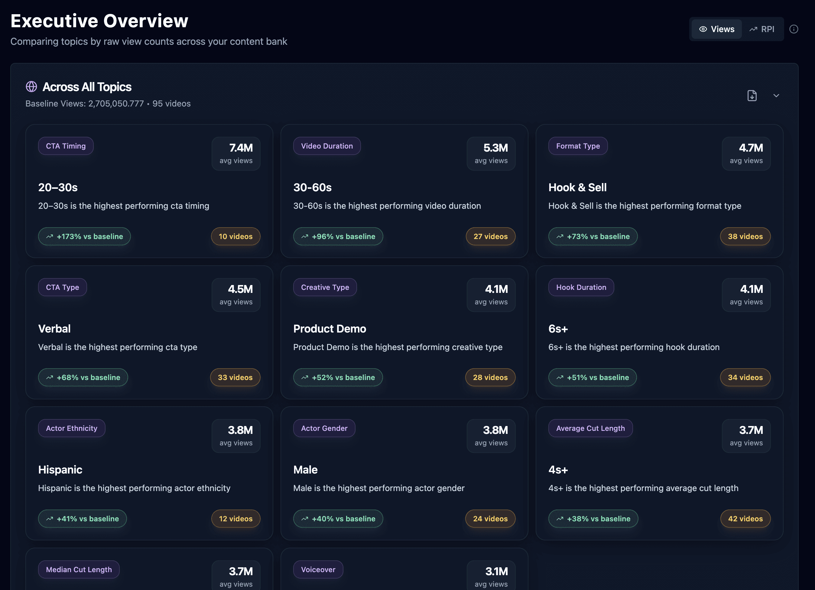 Ask the questions your dashboards can’t answer, from which hook style drives conversions to how your top competitor edits their best-performing videos. Breakdown every frame, trend and pattern to shape your next winning video. So instead of gut instinct, you get creative clarity across every account you manage.